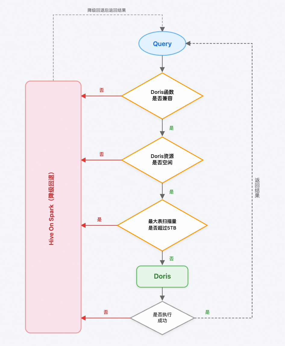 兼容性判断:优先判断 SQL 中使用的函数或语法是否被 SelectDB 支持。得益于 98%的兼容率,绝大多数查询可直达 SelectDB。不兼容时将进行回退至 Hive on Spark。