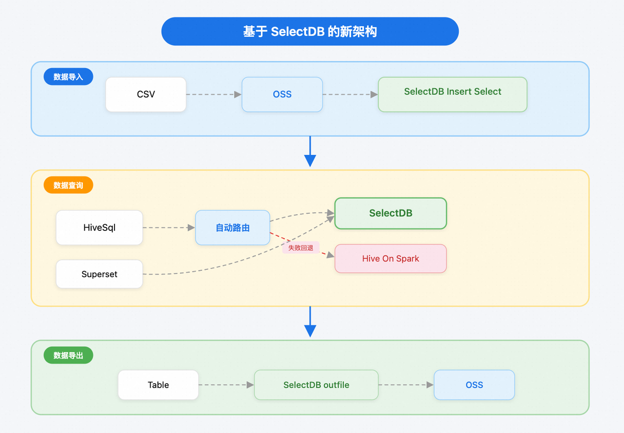 - 数据导入:优化 CSV 导入流程,从依赖物理机与 Hive 命令的复杂链路,转变为数据直传对象存储(OSS),由 SelectDB 通过