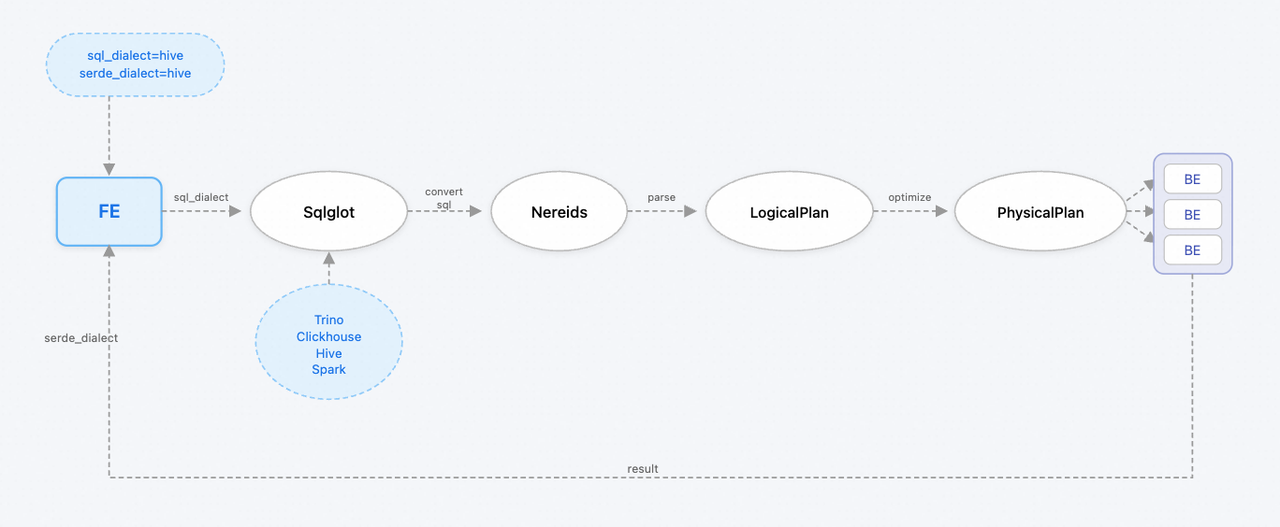 SelectDB 通过sql_dialect与serde_dialect核心参数控制方言转换。流程如下: