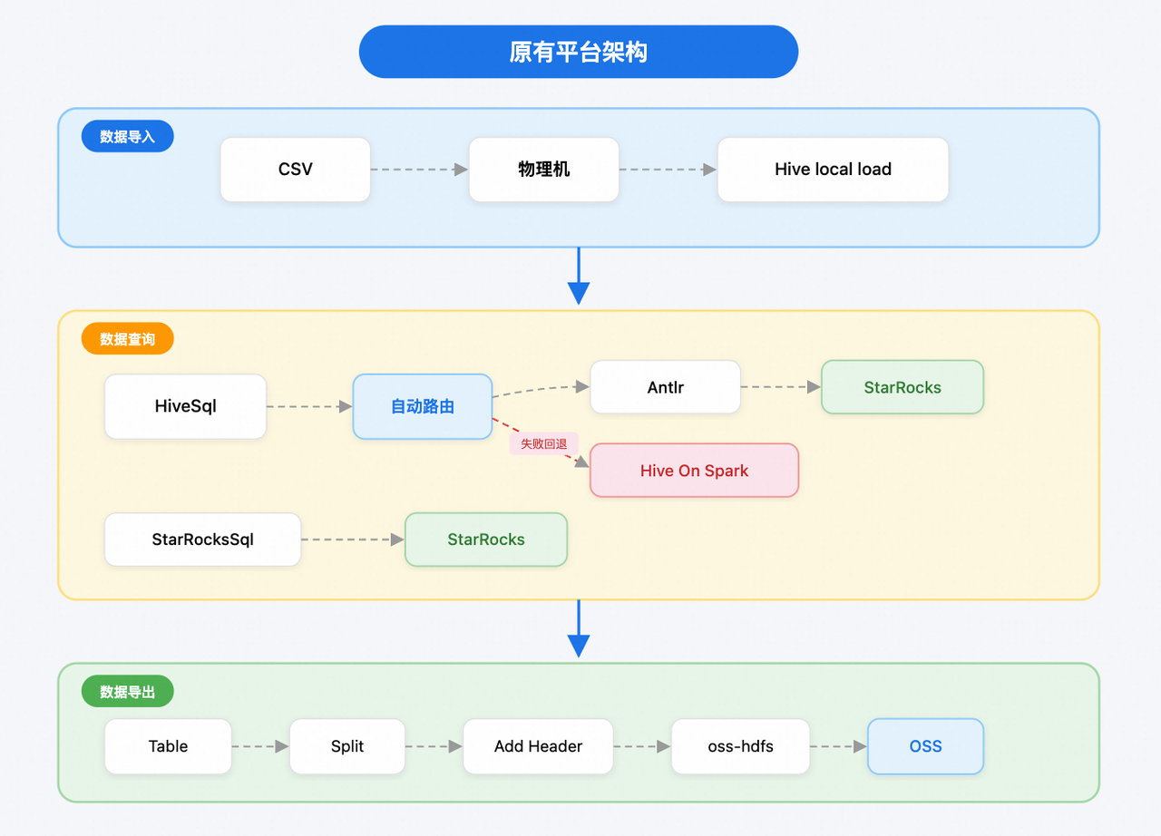 原数据平台采用 Hive 数据湖与多计算引擎(StarRocks / Spark)协同模式,其中 StarRocks 在部分场景中承担查询加速的能力。随着业务全球化与数据规模的迅猛增长,对查询体验及查询性能提出更高要求,原有架构在易用性、查询性能和扩展性方面逐渐暴露出瓶颈。