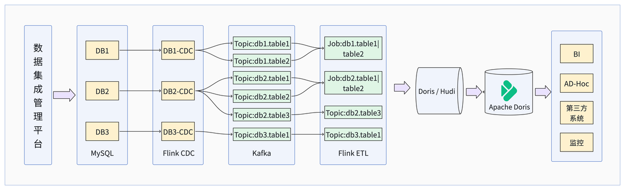 围绕这些目标,团队逐步明确了建设思路:以 Doris 作为实时分析底座,以统一的数据集成管理平台承接实时链路的标准化与自动化能力,完成从数据采集、处理到服务输出的整体升级。